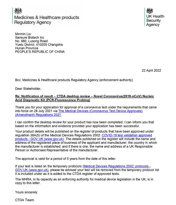 新冠检测试剂在英国上市必须经过CTDA审查和MHRA注册双认证,由于CTDA审查对产品性能的高要求,目前可在英国合法销售的新冠产品并不多。金年会jinnianhui生物新型冠状病毒(2019-nCoV)核酸检测试剂盒(荧光PCR法)临床性能和分析性能均满足CTDA高要求,且得到进一步有效验证,获得了CTDA的充分认可。